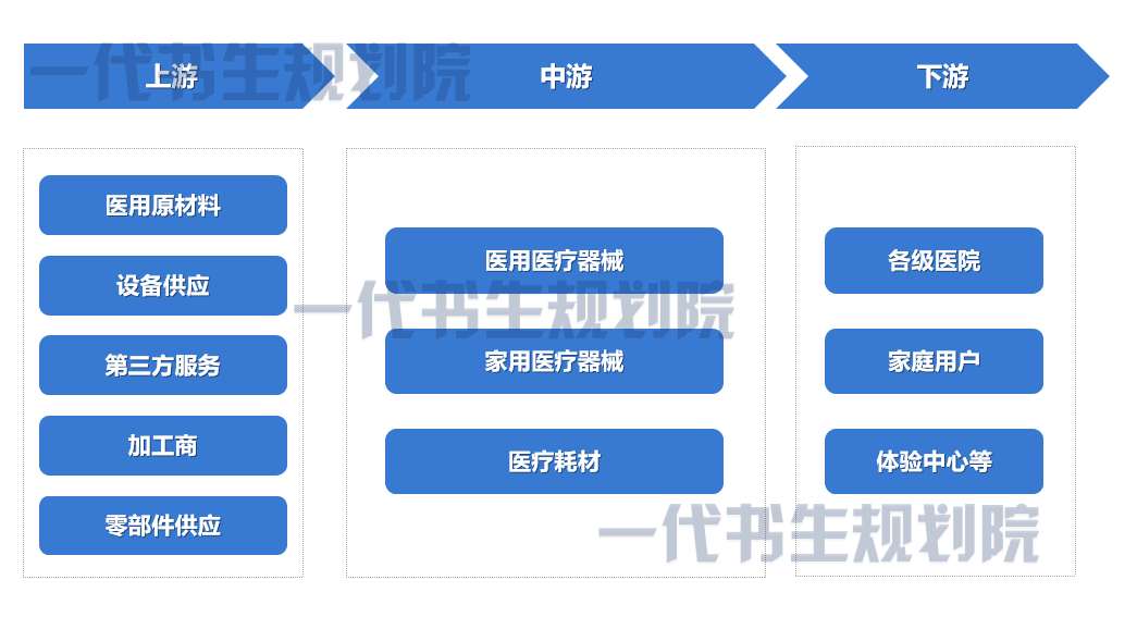 目前,我国中医医疗器械行业已经形成了较为成熟的产业链。上游行业为医疗器械零部件供应、医用原材料、加工商以及第三方服务等,涉及的行业包括电子制造、机械制造、生物化学、材料等;中游行业为医疗器械的生产,包括医用医疗器械、家用医疗器械和医疗耗材的生产。下游应用则包括各类医院、体检中心、社区医疗中心、家庭客户等。