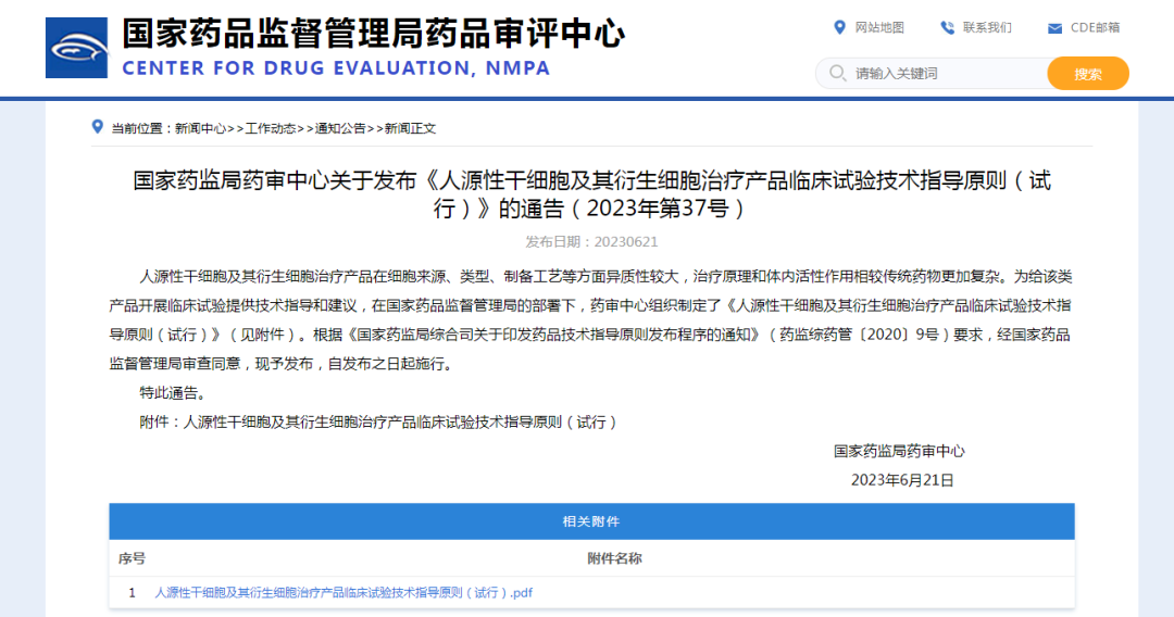 2023年4月27日,国家药监局药审中心(CDE)发布:为规范和指导人源干细胞产品的药学研发、生产和注册,在国家药品监督管理局的部署下,药审中心组织制定了《人源干细胞产品药学研究与评价技术指导原则(试行)》。根据《国家药监局综合司关于印发药品技术指导原则发布程序的通知》(药监综药管〔2020〕9号)要求,经国家药品监督管理局审查同意,现予发布,自发布之日起施行。
