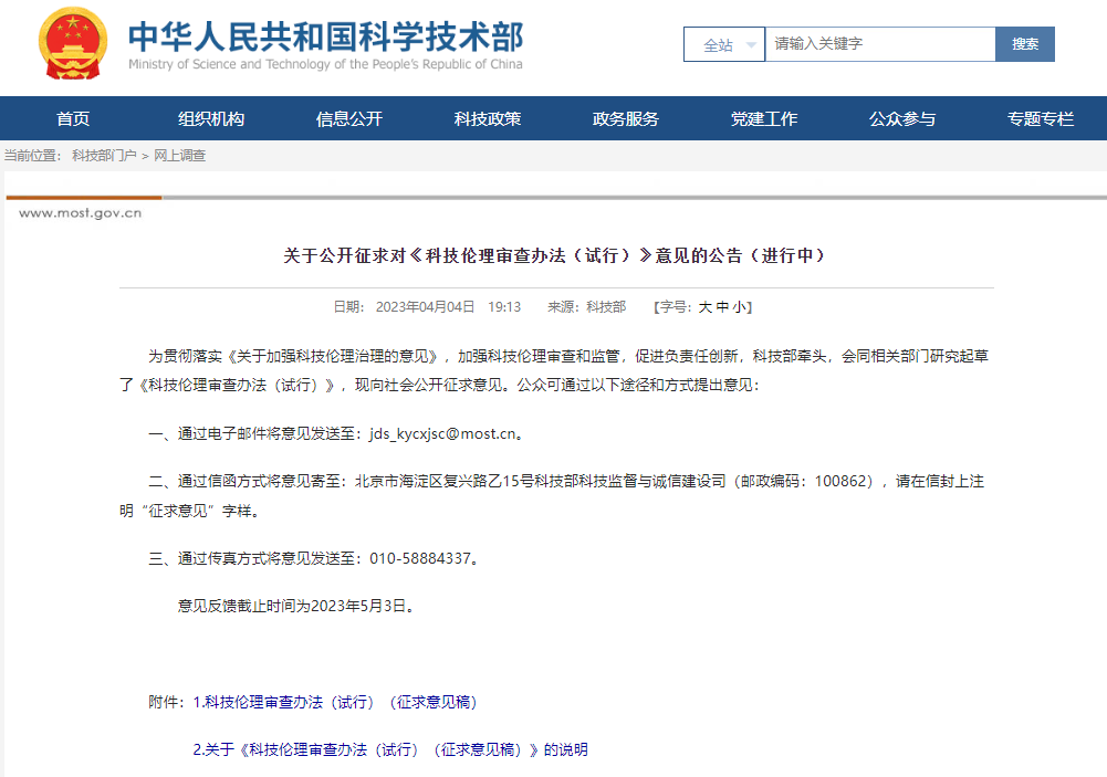 2023年4月4日,科技部发布:为贯彻落实《关于加强科技伦理治理的意见》,加强科技伦理审查和监管,促进负责任创新,科技部率头,会同相关部门研究起草了《科技伦理审查办法(试行)》,现向社会公开征求意见。