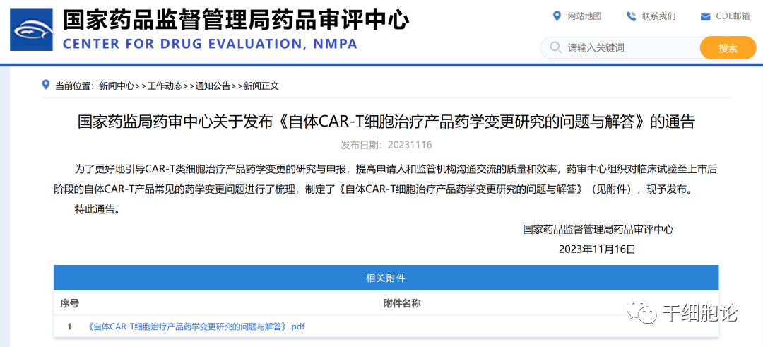 2023年11月16日,中国国家药监局药品审评中心(CDE)官网公示,为了更好地引导CAR-T类细胞治疗产品药学变更的研究与申报,提高申请人和监管机构沟通交流的质量和效率,CDE组织对临床试验至上市后阶段的自体CAR-T产品常见的药学变更问题进行了梳理,制定了《自体CAR-T细胞治疗产品药学变更研究的问题与解答》。