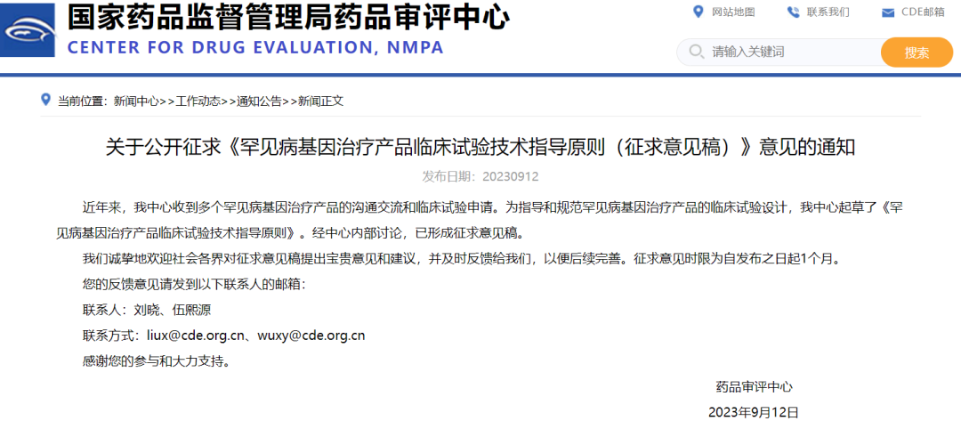 为指导和规范罕见病基因治疗产品的临床试验设计,我中心起草了《罕见病基因治疗产品临床试验技术指导原则》。经中心内部讨论,已形成征求意见稿(征求意见截止时间2023年10月11日)。