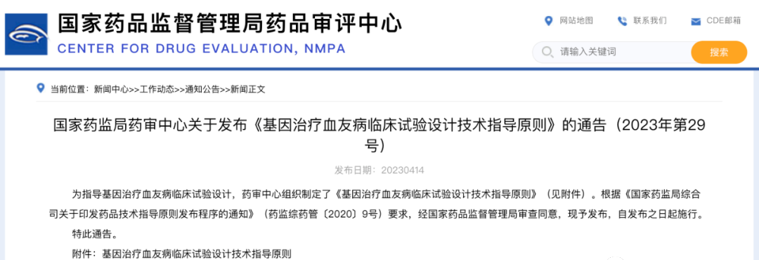 2023年4月14日,国家药监局药审中心(CDE)发布:为指导基因治疗血友病临床试验设计,药审中心组织制定了《基因治疗血友病临床试验设计技术指导原则》。根据《国家药监局综合司关于印发药品技术指导原则发布程序的通知》(药监综药管〔2020〕9号)要求,经国家药品监督管理局审查同意,现予发布,自发布之日起施行。