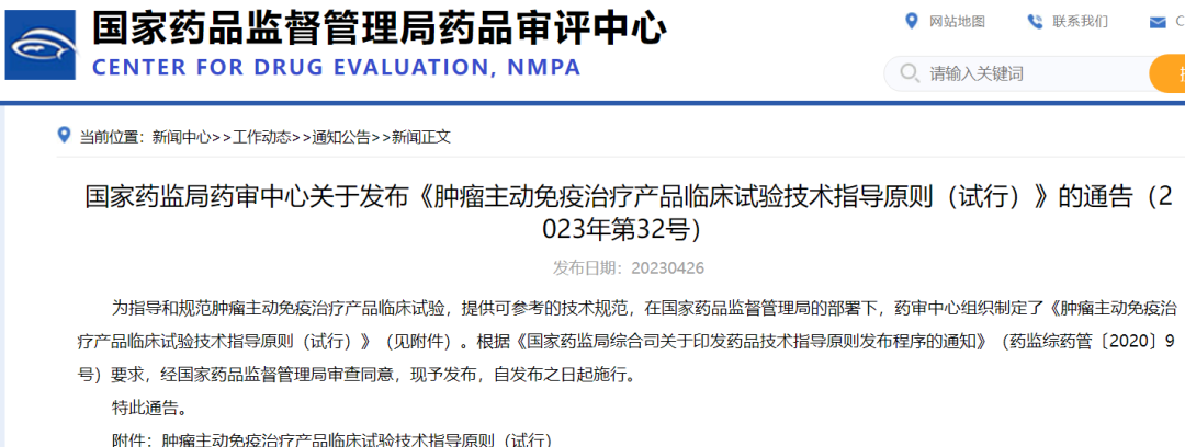 2023年4月26日,国家药监局药审中心(CDE)发布:为指导和规范肿瘤主动免疫治疗产品临床试验,提供可参考的技术规范,在国家药品监督管理局的部署下,药审中心组织制定了《肿瘤主动免疫治疗产品临床试验技术指导原则(试行)》。