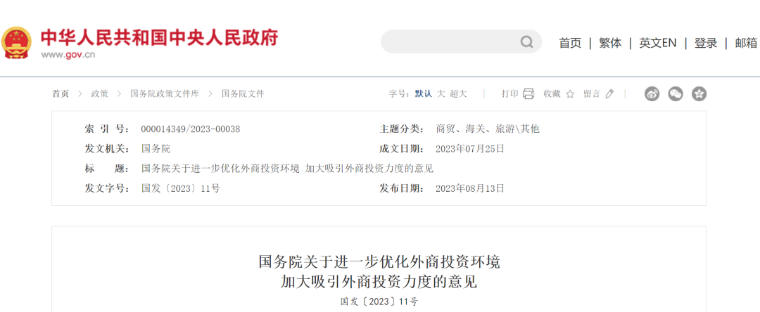 2023年08月13日,国务院发布国务院关于进一步优化外商投资环境 加大吸引外商投资力度的意见的通知。