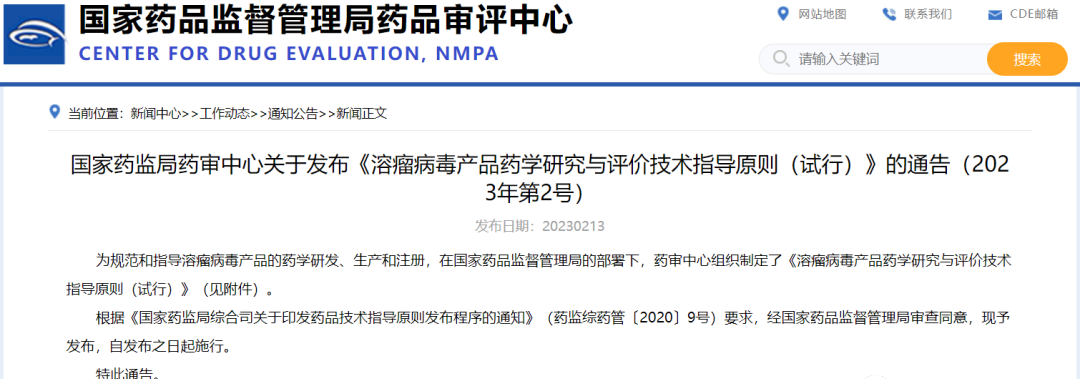 2023年2月,为规范和指导溶瘤病毒产品的药学研发、生产和注册,在国家药品监督管理局的部署下,药审中心组织制定了《溶瘤病毒产品药学研究与评价技术指导原则(试行) 》 。