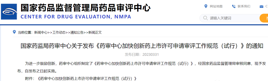2023年3月31日,国家药监局药审中心(CDE)发布:为进一步鼓励创新,药审中心组织制定了《药审中心加快创新药上市许可申请审评工作规范(试行)》,经国家药品监督管理局审核同意,现予发布,自发布之日起实施。