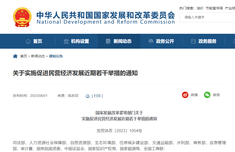 2023年8月1日,国家发展改革委等部门联合发布关于实施促进民营经济发展近期若干举措的通知。