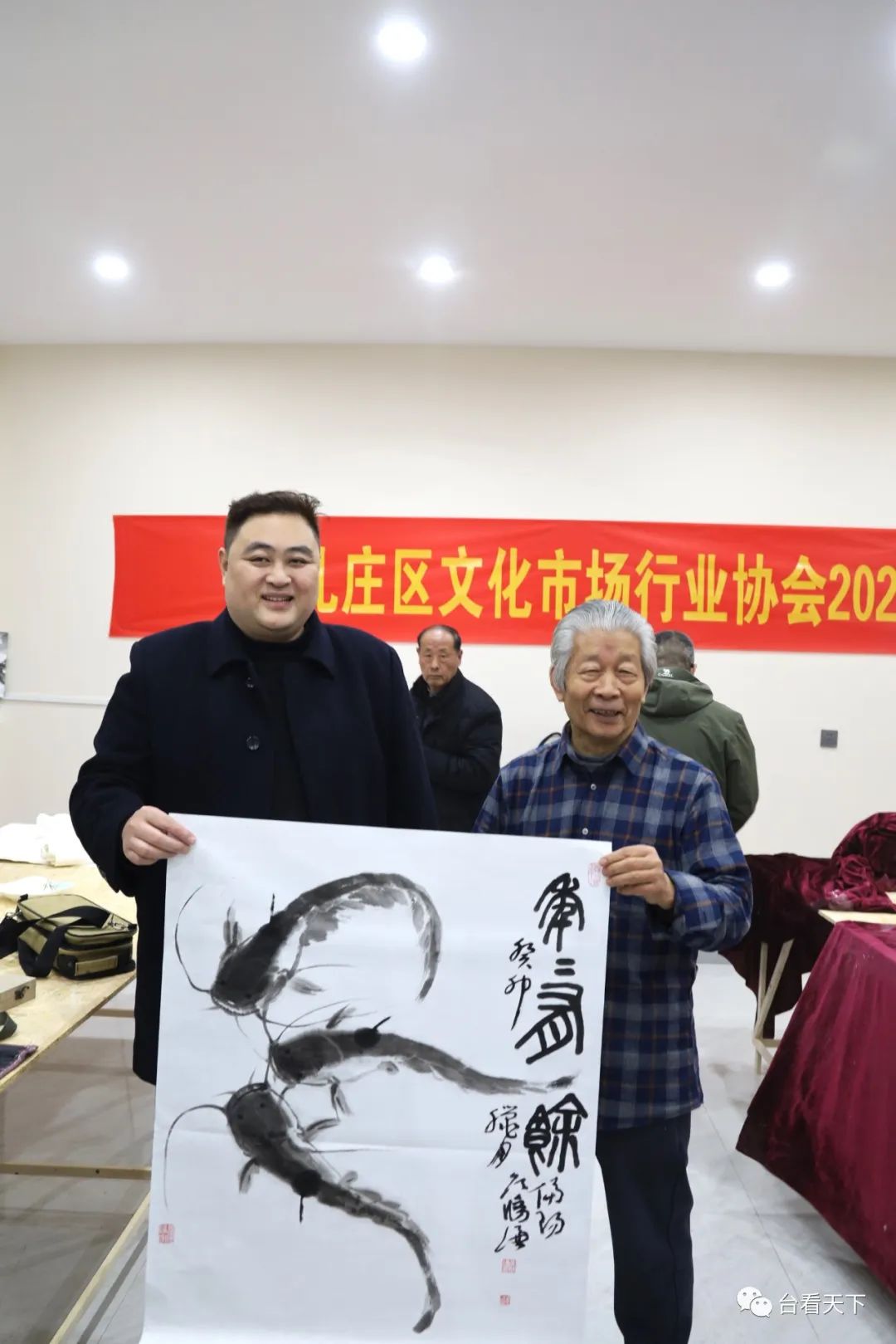 为回馈文化企业,迎元旦、庆祝新春,营造传统文化浓郁的年会,邀请区美协、区书协、王履安书法艺术研究会、台儿庄书画院、瞻堂书院、两岸文学艺术馆书画家,特邀国画家、章草书法家侯修谦。书法家袁善中,区书协主席刘光,区美协执行主席、中国美术家协会会员武广军,区美协副主席、两岸文学艺术馆签约国画家孙中斌,区书协副主席、中国书法家协会会员朱麒睿,书法家张中华等艺术家挥毫泼墨,奉上一场艺术的享受与传统文化的宴席。(文图 李瑞刚 时培京 刘同林)