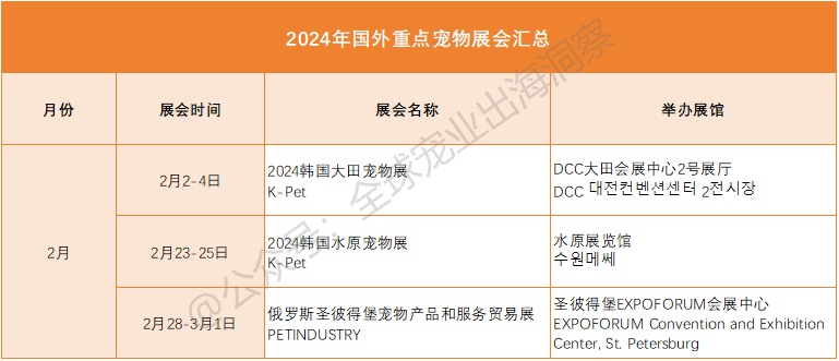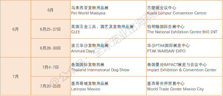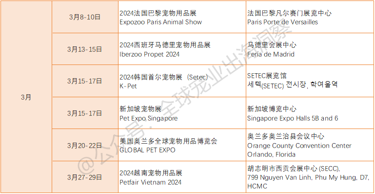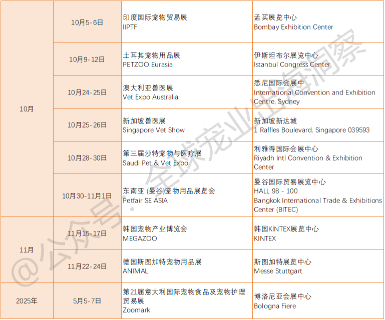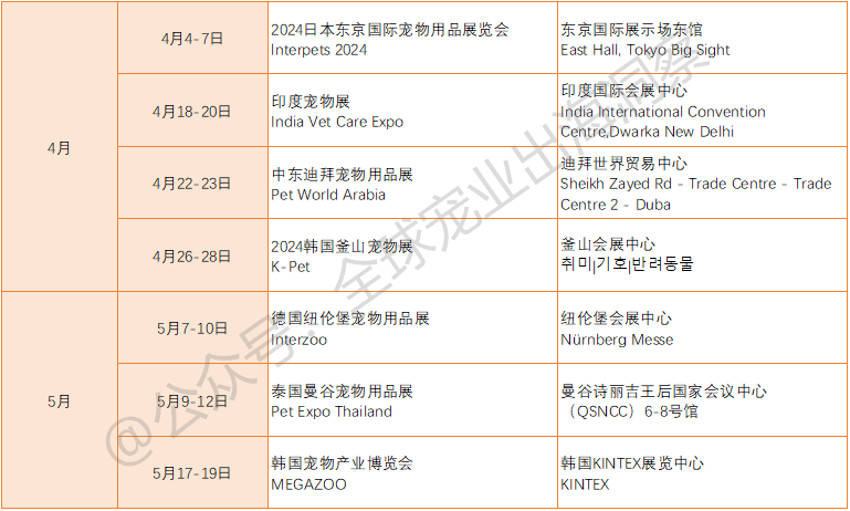 目前已官宣举办的国外宠物展会,包括但不限于(如下表):