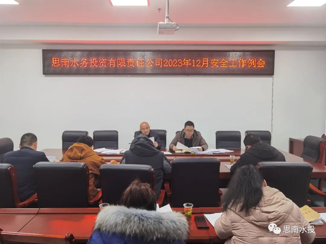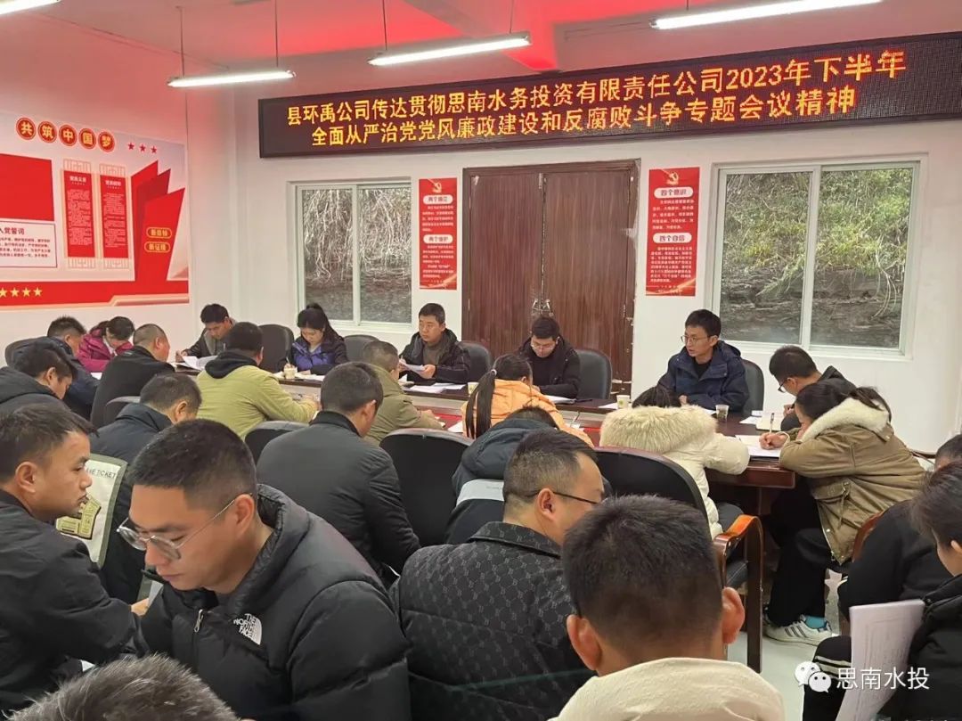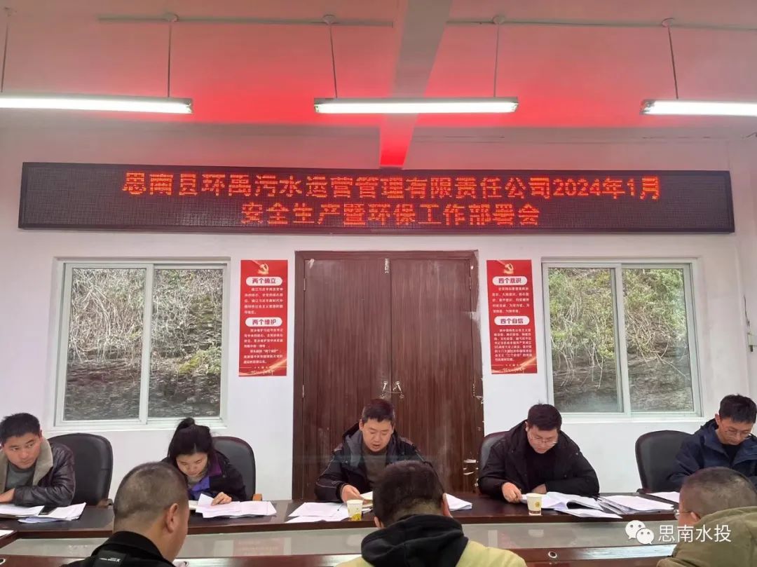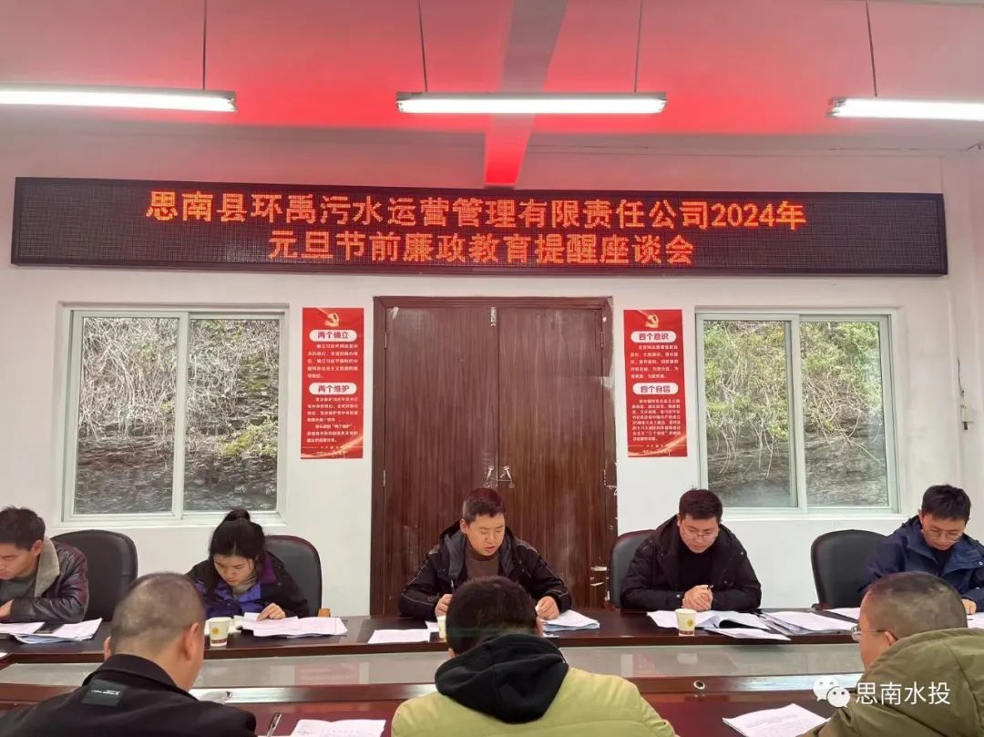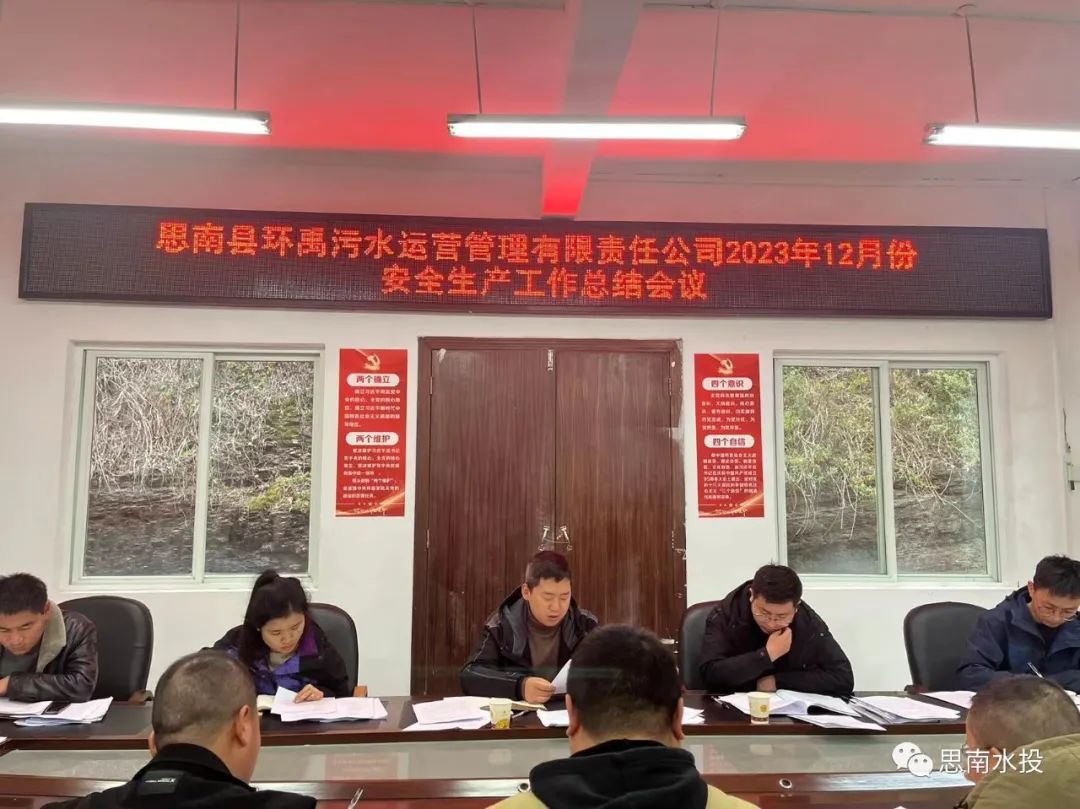 12月29日,县环禹公司传达思南水务投资有限责任公司2023年下半年全面从严治党党风廉政建设和反腐败专题斗争专题会议精神、2024年年元旦节前廉政教育提醒座谈会、1月份安全生产暨环保工作部署会,2023年12月安全生产工作总结会议,公司班子成员、各部门及各污水处理厂负责人参加会议。