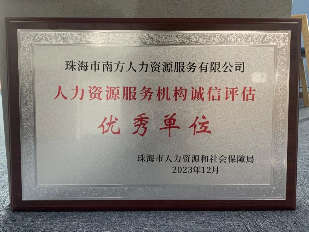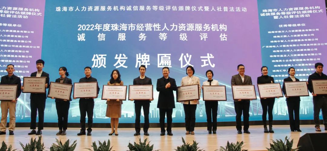 12月27日上午,在珠海市人力资源和社会保障局主办的“珠海市人力资源服务机构诚信服务等级评估颁牌仪式暨人社普法活动”上,珠光集团下属珠海市南方人力资源服务有限公司(下称南方人力公司)以全市最高评分获珠海市人力资源服务机构诚信服务等级评估优秀单位。