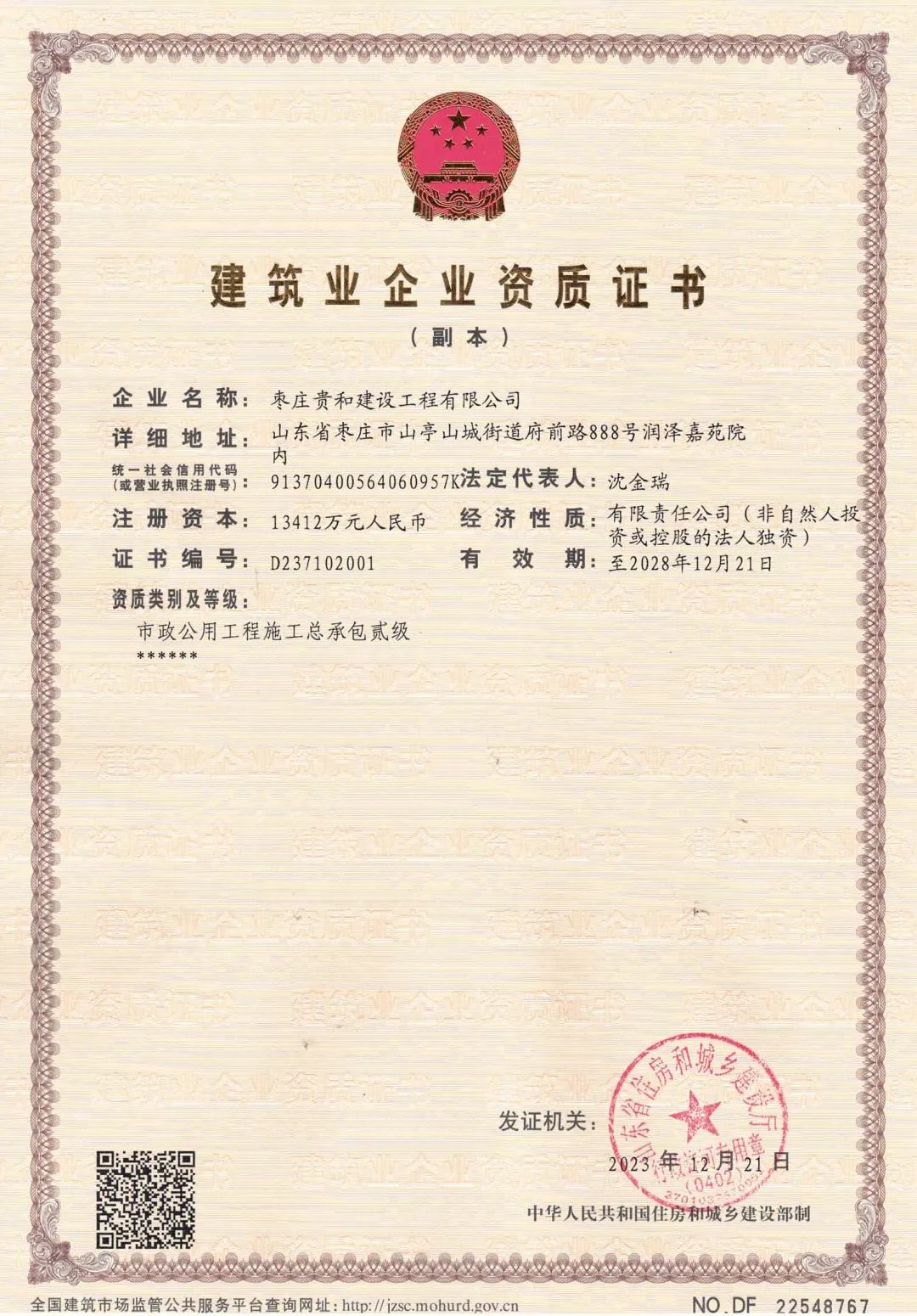 12月28日,贵和公司取得市政施工总承包二级资质证书。