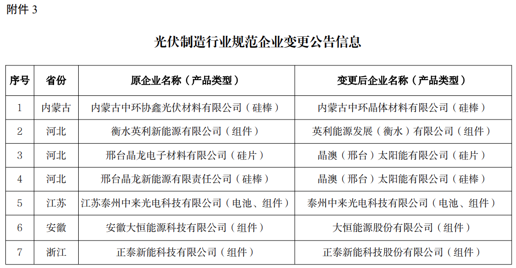 按照《国务院关于促进光伏产业健康发展的若干意见》(国发〔2013〕24号)要求,根据《光伏制造行业规范条件(2021年本)》及《光伏制造行业规范公告管理暂行办法(2021年本)》规定,经企业申报、省级工业和信息化管理部门推荐、专家复核、现场核实、网上公示等程序,确定符合《光伏制造行业规范条件》企业名单(第十二批)、撤销光伏制造行业规范公告企业名单(第七批),现予以公告。光伏制造行业规范企业变更公告信息和现行有效符合《光伏制造行业规范条件》企业名单(前十一批),一并予以公告。