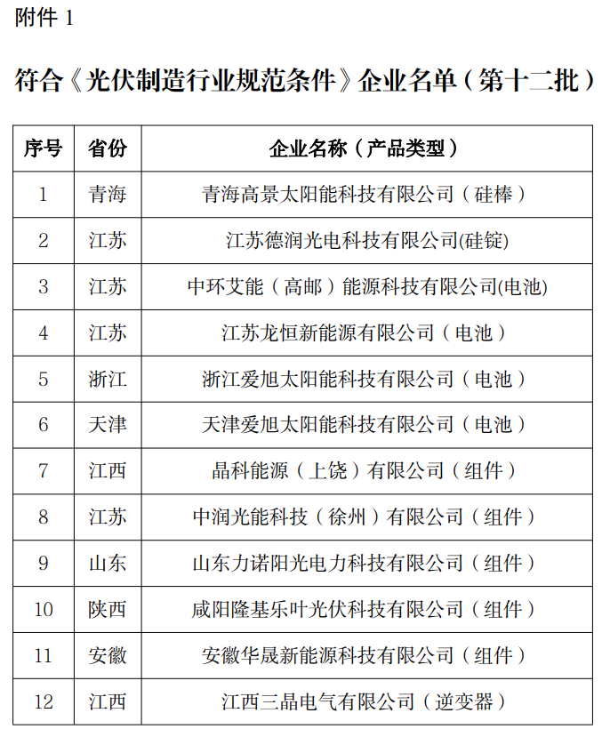 1.符合《光伏制造行业规范条件》企业名单(第十二批)