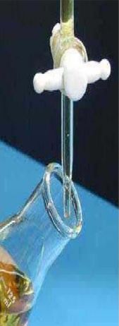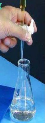 下图为当滴定时,位于滴定管口的悬垂溶液也应引入锥形瓶中的待滴定液内;而在滴定开始时管口的悬垂液滴也要以同样的方法移走,确保由滴定管上读取的滴定的实际用量准确。