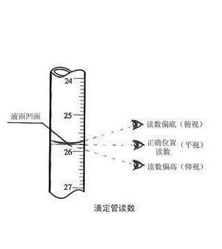 手拿管上部无刻度处,使滴定管保持垂直。无色或浅色溶液,读弯月面下缘最低点的数值,且眼睛与此最低点在同一水平上。