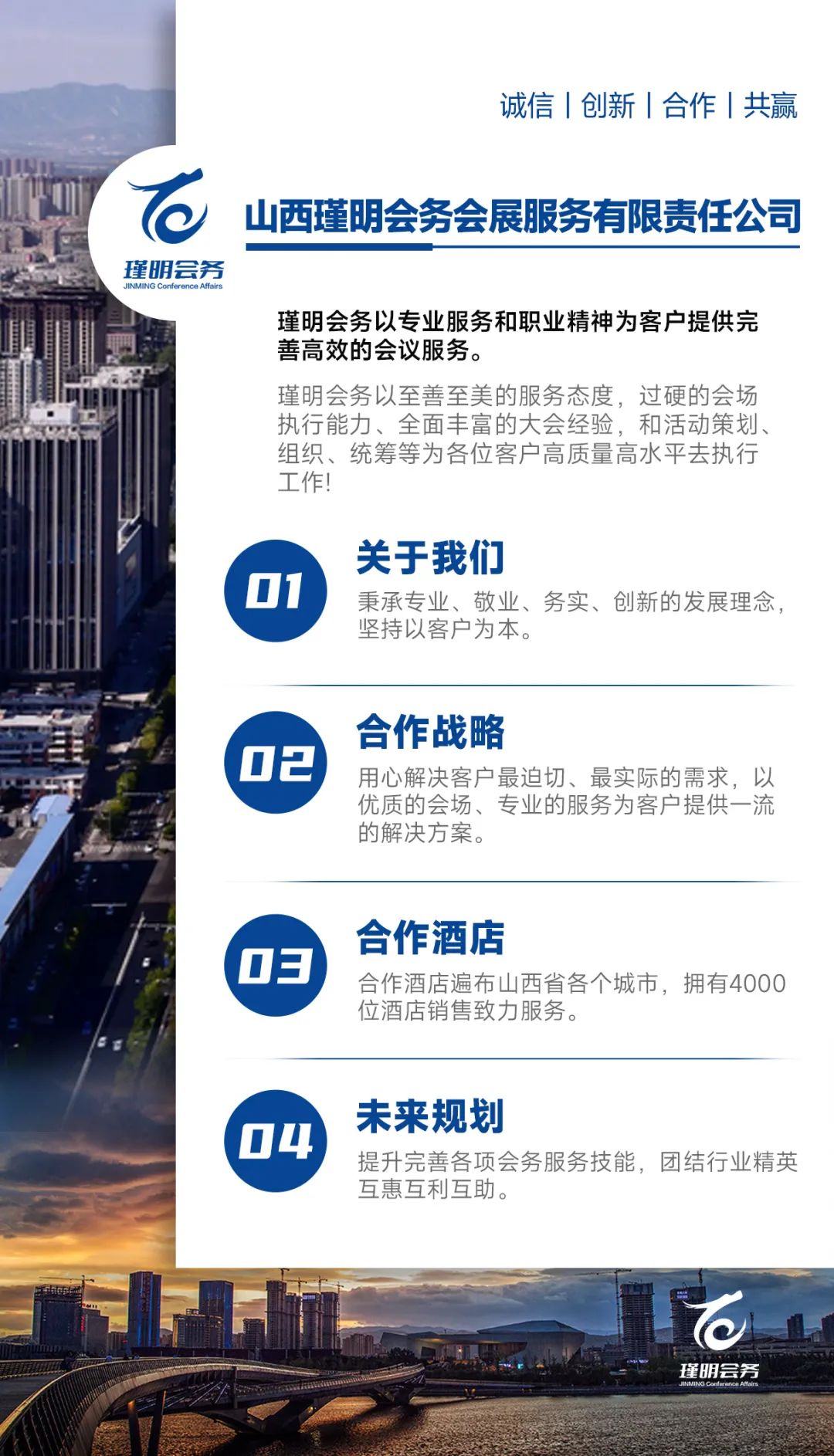 我们诚挚地邀请您加入山西瑾明会议会展服务有限责任公司的行列,让我们的专业团队为您的会议活动注入独特的魅力与精彩吧!我们将用专业的技能和优质的服务,为您的活动添彩,让您的会议活动成为行业的亮点。无论您是举办大型会议还是小型研讨会,我们都将竭诚为您提供专业的支持和帮助。请随时联系我们,我们将随时为您提供专业的咨询服务和预订服务。山西瑾明会议会展服务有限责任公司期待与您携手共创美好!