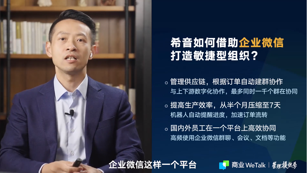 希音找到的方法是,用企业微信去管理供应链。从原材料的采购,到分销渠道的选择、客户关系的维护,这一流程中每个外部环节的效率,都将影响整体供应链的效率,也直接影响企业响应顾客需求的速度。利用企业微信的开放的能力,每天根据系统订单自动建订单协作群,合作伙伴在一个平台上快速共享信息。信息在业务流上进行超高速的流转,从打样到生产出来,传统服装品牌需要半个月,但希音7天就能搞定。这也是企业外部平台化、生态化带来的价值。这是企业需要在数字化时代实现的转变之一。