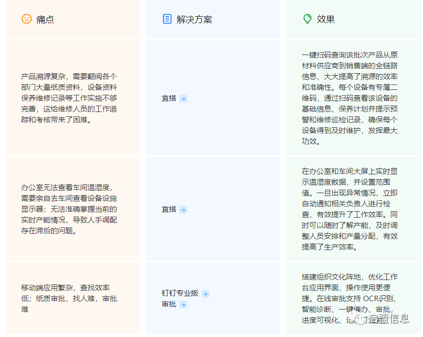 工厂生产量不断提升,设备使用频率也随之增加。设备的养护决定了生产的稳定性和产能提升的关键。过去,设备维护记录只靠工作人员手写,记录不全面、无法追踪考核。现在,每台设备都有专属二维码,通过钉钉系统,记录清晰、完整,维护时间精确,并能及时提示预警和维修巡检记录,让每个设备都能得到最及时的维护,记录和管理效率都得到了有效的提升。