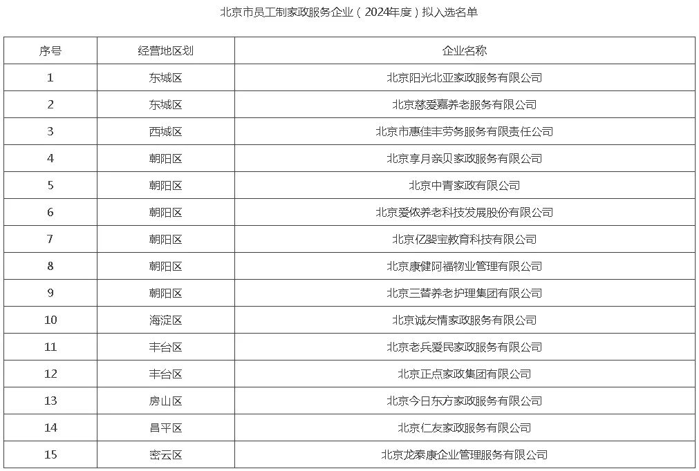 按照《国务院办公厅关于促进家政服务业提质扩容的意见》(国办发〔2019〕30号)精神,根据北京市发展和改革委员会 北京市商务局 北京市人力资源和社会保障局《关于公开征集北京市员工制家政服务企业(2024年度)名单的通知》,经企业自愿申请,市促进家政服务业提质扩容联席会议相关部门审核,现将拟入选的15家北京市员工制家政服务企业(2024年度)予以公示,公示时间为7个工作日,公示期内接受社会监督。