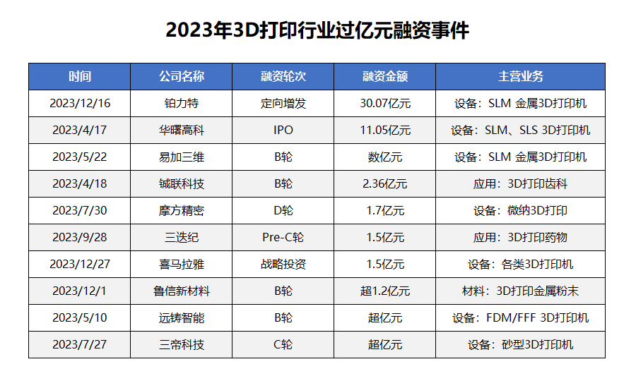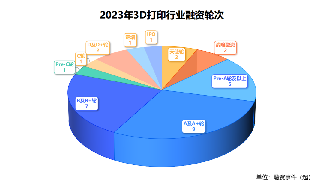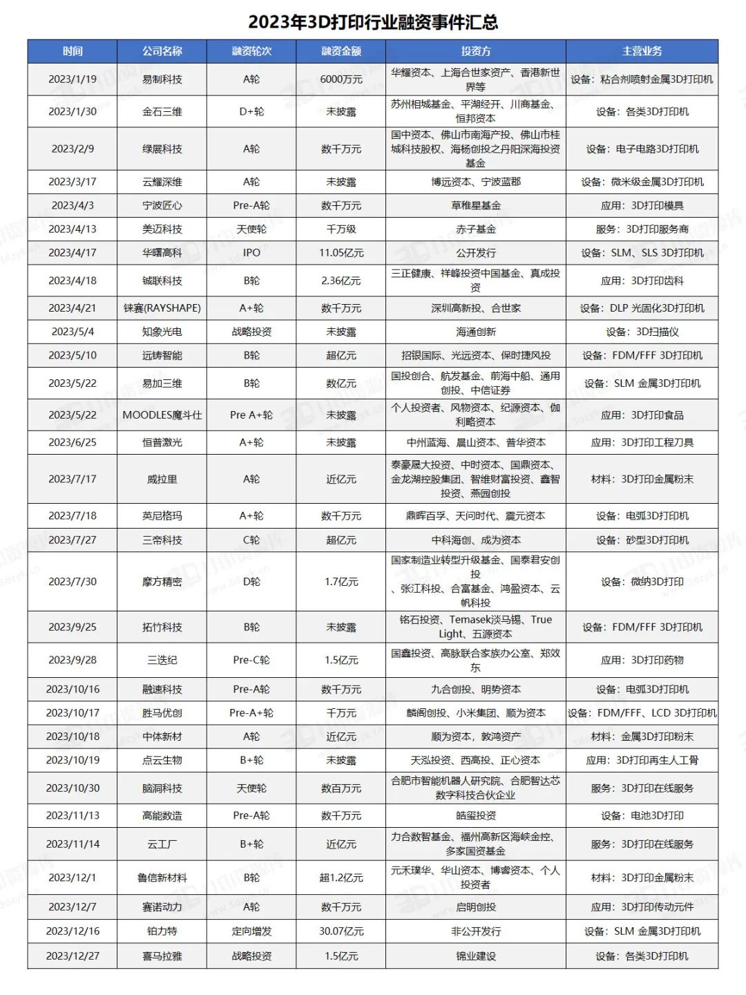2023年,是中国3D打印行业高速发展的第十一个年头。在这一年里,得益于国家相关政策的有力支持和行业国家标准的持续完善,以及各种应用领域的需求旺盛,3D打印行业在探索中逐渐趋于明朗。资源库对2023年3D打印行业的融资数据进行了梳理,从资本视角出发,旨在洞察3D打印行业发展的新趋势和方向。(文末附全年融资事件统计表)