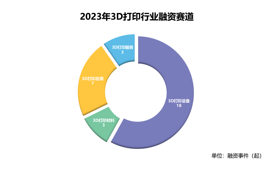 在2023年的3D打印行业细分领域中,设备相关的融资活动最为频繁,共有18起融资事件,占比达到58.06%。3D打印应用领域以7起融资事件位居第二;3D打印材料和服务领域各有3起融资。此外,去年还有漫格科技在软件方面获得一笔融资,但到了2023年这一赛道暂无融资。事实上,3D打印的发展离不开软件支持,这是一个不可或缺的环节,希望得到资本的持续投入。
