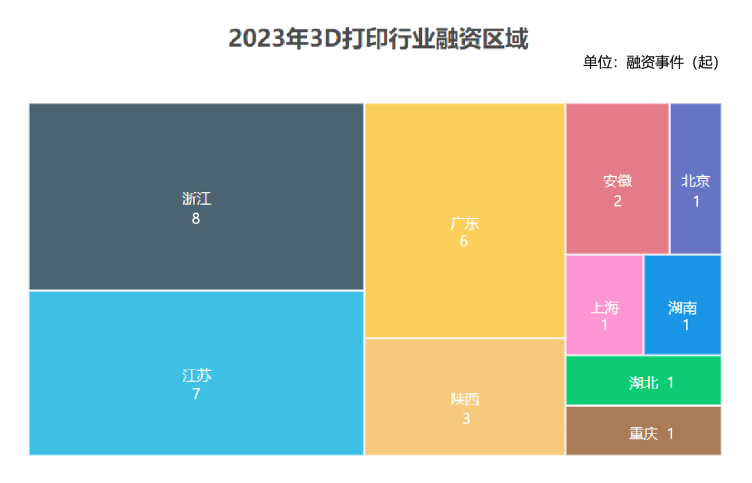 从融资金额来看,2023年陕西位居首位,融资总额达到30.37亿元,占整体融资金额的50.52%。湖南排在第二位,虽然只有华曙高科一家,但这也是2023年唯一一家3D打印上市企业,融资11.05亿元,占比18.38%。