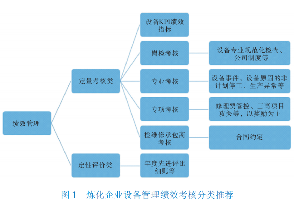 炼化企业若想科学、合理的选择绩效考核指标,并对绩效指标实行分级控制,可以考虑将绩效指标分为关键绩效指标和关注绩效指标。指标的类型可分为定量考核类和定性评价类。定量考核类可分为设备 KPI 、岗检考核、专业考核、专项考核、检维修承包商考核等细分类。企业对于当年度需要重点提升、督促引导的工作,可设立分档指标或设立专项考核,加大激励力度,如设备事件、设备原因引起的非计划停工、生产异常、修理费管控、三高( 高频检修、高频更换备件、高费用检修)项目攻关等。