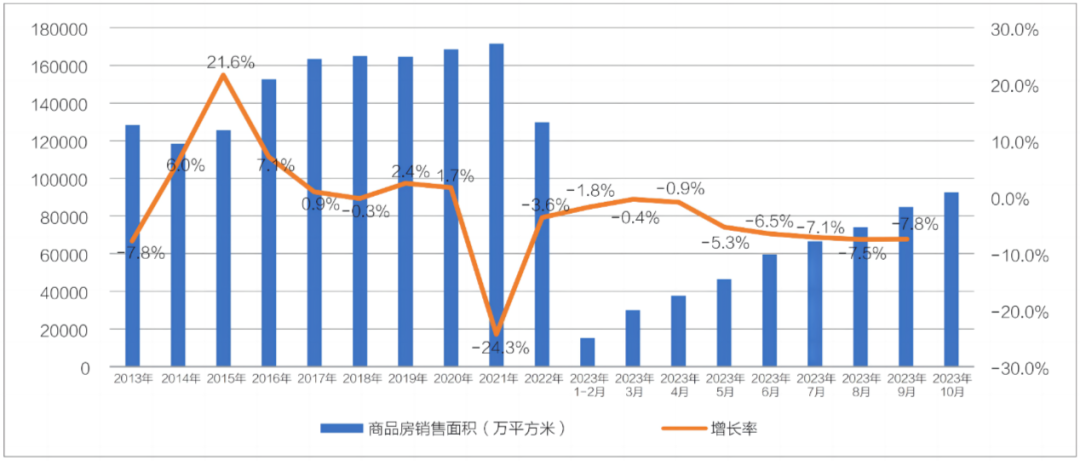 2023年以来,基础设施投资在高水平下增速有所回落。增速的回落和地方财政有一定关联。2023年,土地市场成交低迷,土地出让金收入持续下行,拖累政府性基金收入。2023年1–10月,地方政府性基金收入同比下降16.8%,国有土地使用权出让收入同比下降20.5%。总体来看,2023年基础设施投资仍将保持较高增速,预计全年同比增长8%左右。