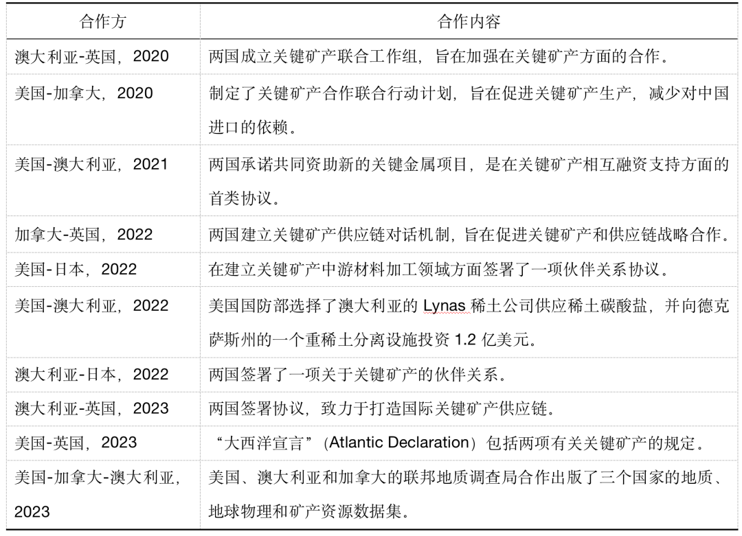 从美国的角度来看,向可信赖的国家提供友好的供应链有望带来双重好处:既能提振美国经济,又能加强美国与结盟贸易伙伴的关系。美国财政部强调了“友岸外包”的潜力,强调了其在确保安全的市场准入和降低风险方面的作用——这两者对于当今相互交织的全球市场的经济增长至关重要。甚至在MSP成立之前,友岸外包就有助于加强拥有公认的关键矿产资产或从事战略合作的国家之间的联系。涉及关键矿产的重要合作项目包括: