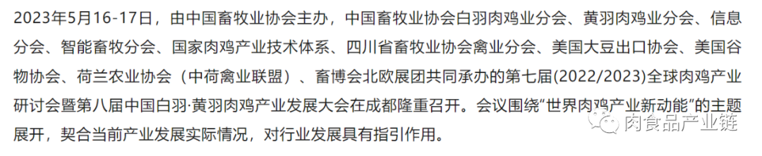 2023年5月16-17日,在成都由中国畜牧业协会主办的“第七届(2022/2023)全球肉鸡产业研讨会暨第八届中国白羽·黄羽肉鸡产业发展大会”召开,参会人员围绕“世界肉鸡产业新动能”的主题进行了交流,主要观点如下: