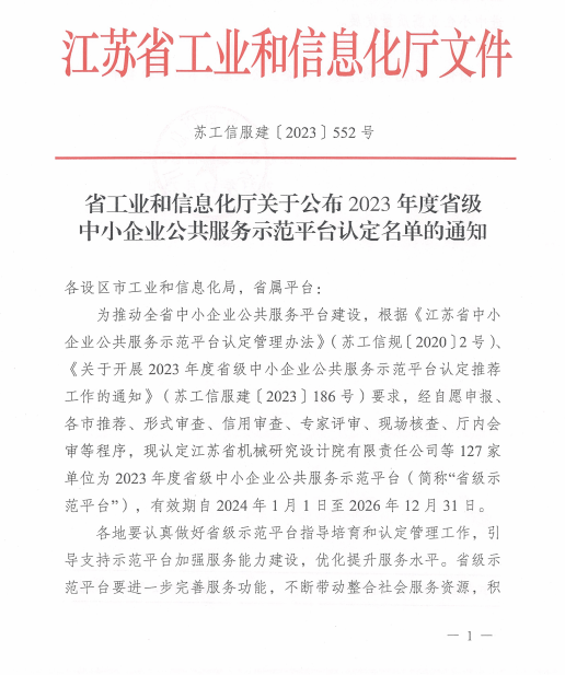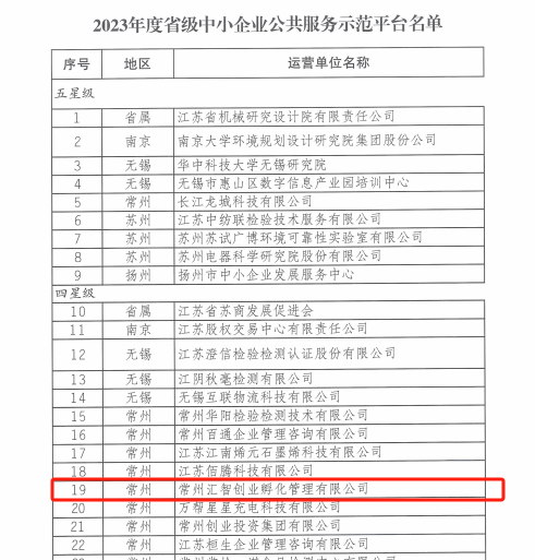 近日,江苏省工业和信息化厅公布了2023年度省级中小企业公共服务示范平台认定名单,位于五星街道的常州汇智创业孵化管理有限公司荣登榜单,被认定为省级四星级平台。