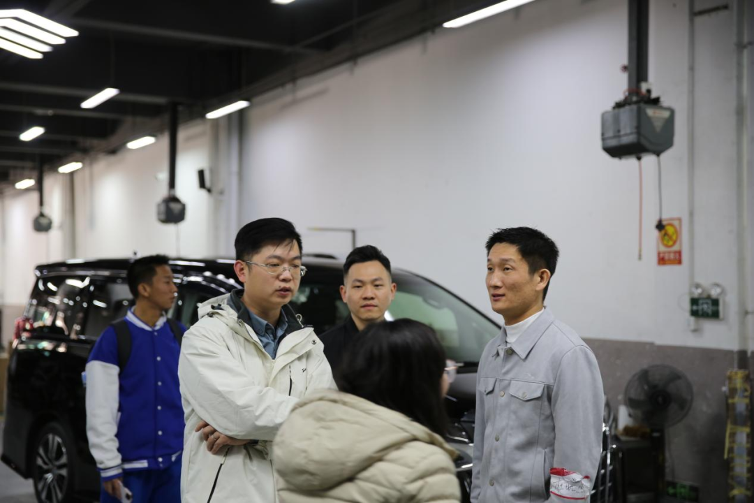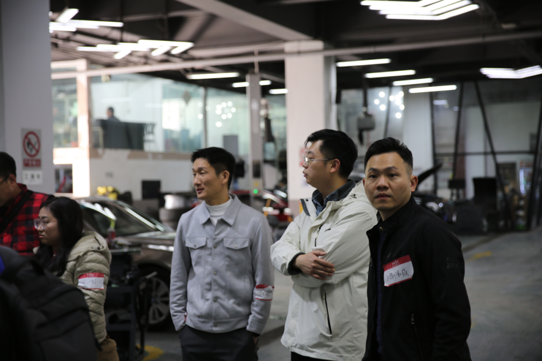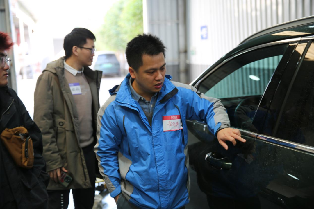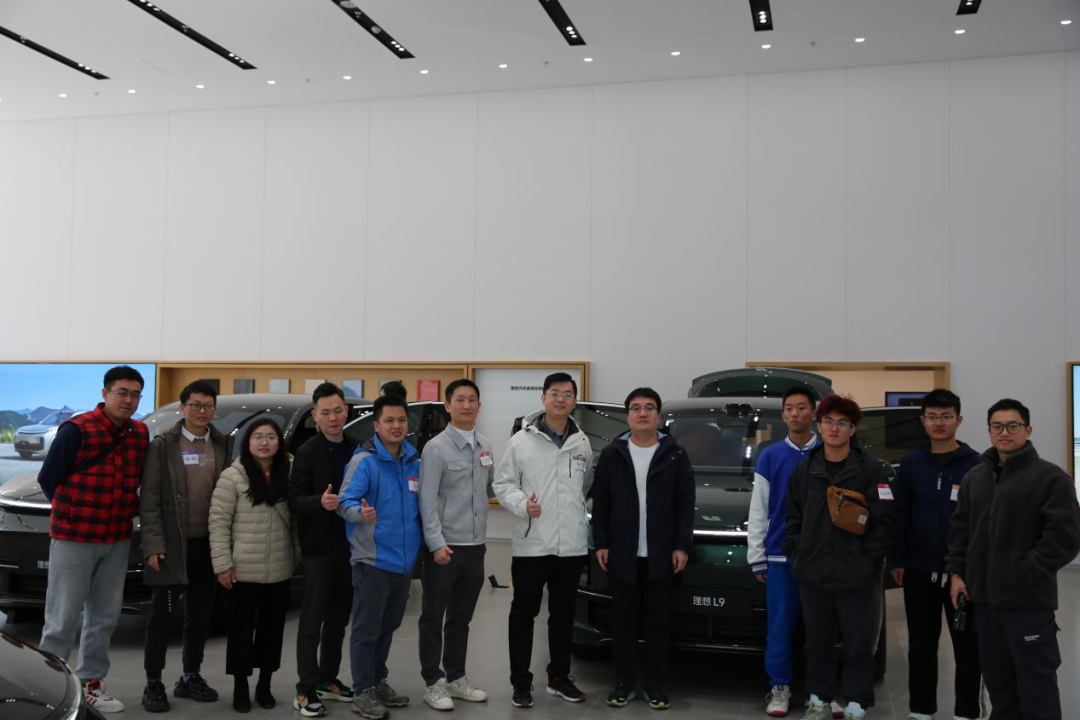 参与活动的校友在杜晓杰的介绍下,实地参观了校友企业的售后钣喷中心及对新势力理想汽车的车型了解和体验。