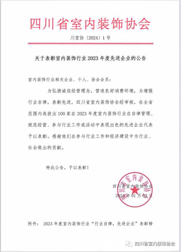 2023年度室内装饰行业“行业自律,先进企业”表彰榜 |