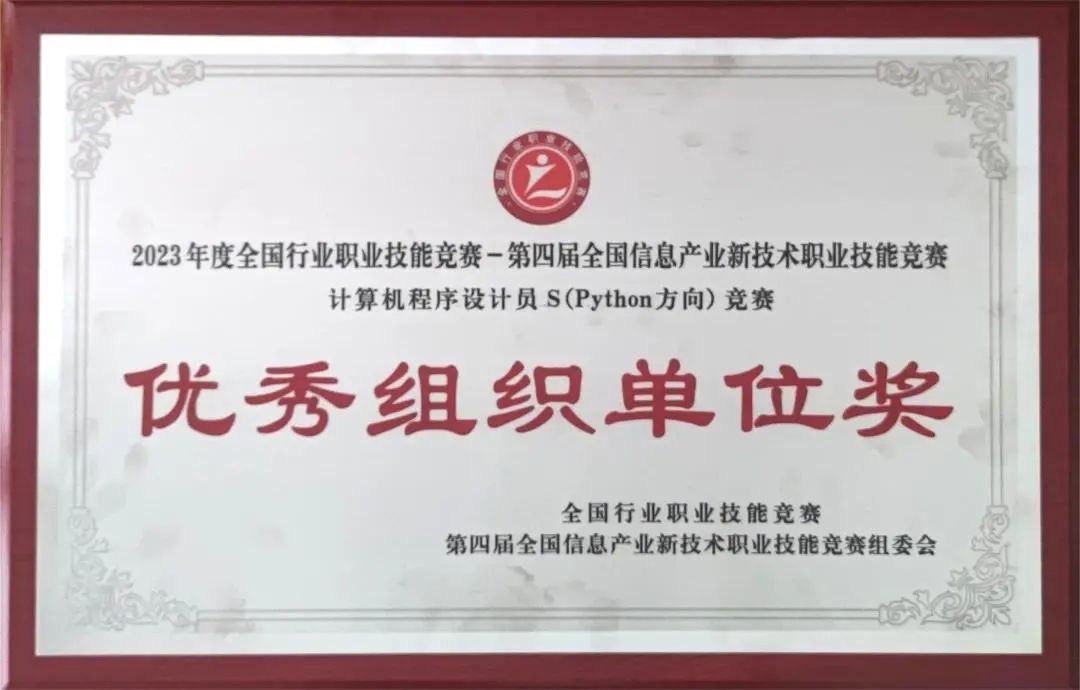 我校在承办2023年全国行业职业技能竞赛第四届全国信息产业新技术职业技能竞赛广西选拔赛计算机程序设计员S(Python方向)竞赛时组织办赛工作表现出色,荣获2023年度全国行业职业技能竞赛计算机程序设计员S(Python方向)竞赛优秀组织单位奖。