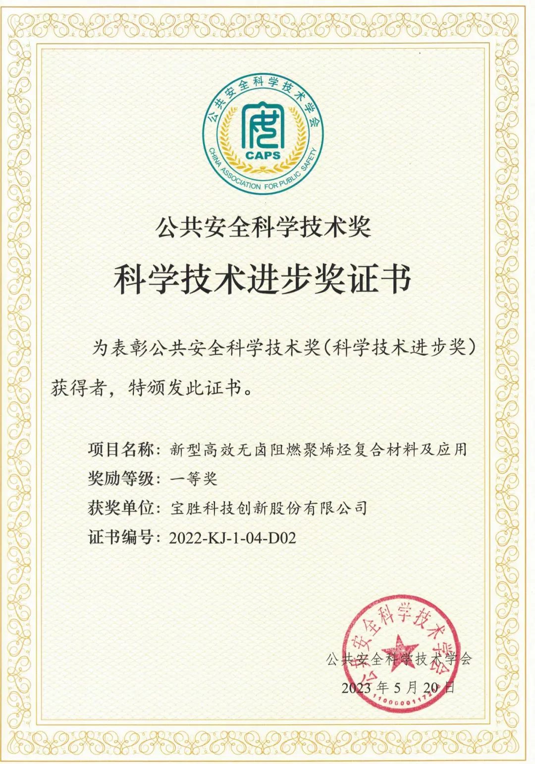 近日,国家公共安全科学技术学会公布了“2023年度公共安全科学技术奖”获奖名单,宝胜股份“新型高效无卤阻燃聚烯烃复合材料及应用”项目荣获科学技术进步奖一等奖。
