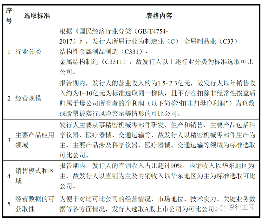 发行人属于精密机械零部件行业,生产产品主要涉及科学仪器、医疗器械、交通运输等领域,发行人所处行业较为细分,目前国内市场不存在与发行人具有完全可比性的上市公司;发行人综合考虑了行业分类、经营规模的匹配性,主要产品应用领域、销售模式和区域以及经营数据的可获得性等因素确定同行业可比公司的选取标准,具体如下:
