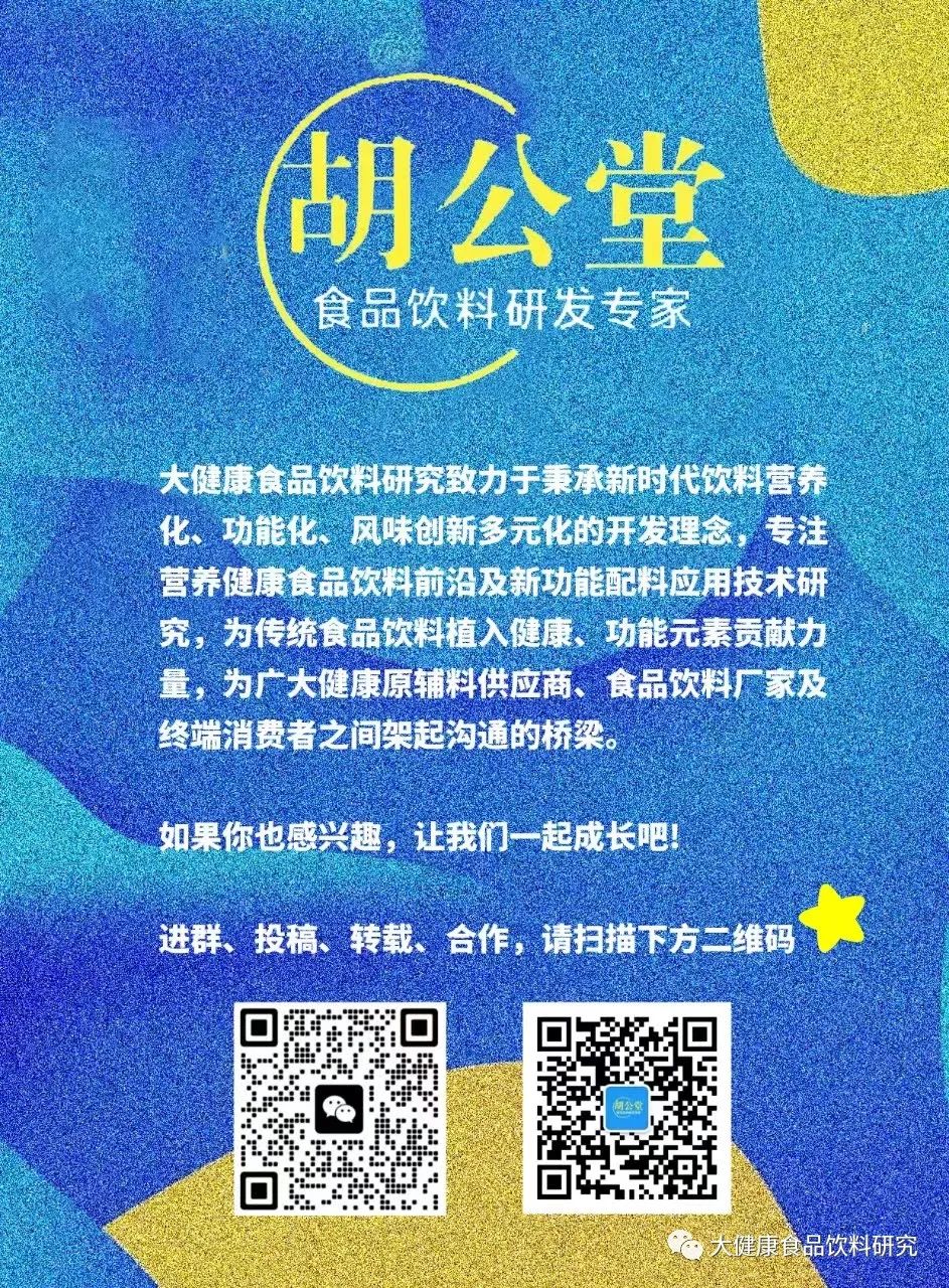 **胡公堂大健康食品饮料研究标明原创的文章权限为本网所有,如需转载授权请联系HFBR99(微信)开白授权,转载时请务按要求注明出处,不得修改原创文章主要内容。