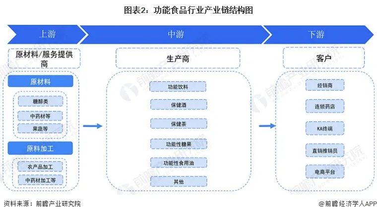 功能食品概念相关产业按价值链自上而下主要可分为三大部分:即上游原材料及原料加工、中游功能食品生产及下游零售环节。上游原材料包括糖醇类、中药材、果蔬等。原材料加工则主要包括农产品加工、中药材加工等;中游部分按照功能食品种类可以分为功能饮料、保健酒、保健茶、功能性糖果、功能性食用油等;下游部分根据销售渠道的不同,包括有经销商、连锁药店、电商平台等。