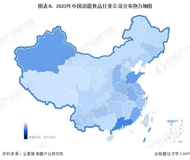 近年来,我国功能食品行业市场规模稳步增长,但2019年受到“权健”事件的影响以及一系列监管政策出台的影响,功能食品行业整体增速下滑。经初步统计,2023年中国功能食品市场规模达到3523亿元,2016-2023年年均复合增长率达到6%,增速良好。从中国功能食品产品结构来看,维生素及膳食营养补充剂是功能食品中占比最大的细分品类,中国占比54.94%。目前中国运动营养品和体重管理产品占比小,仅1.19%和4.34%。——区域竞争:集中在华南地区