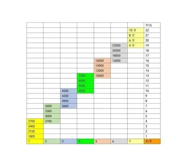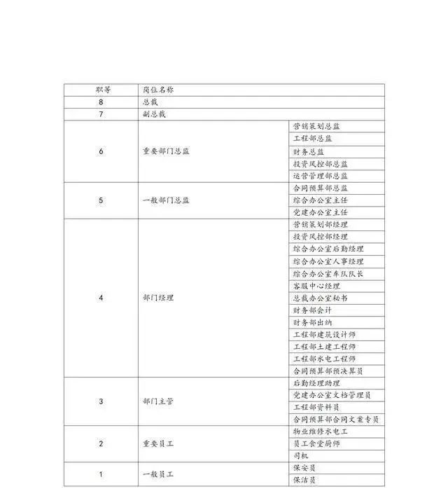 共分为8个职位等级,每个职位等级工资有四个档位,每一档位分别与月度绩效考核结果“优”、“良”、“及格”“不及格”一一对应,即“优”对应所在职位的最高档次的工资,以此类推。