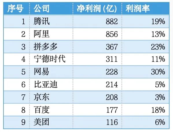 截至2023年第三季度末的财报数据,除了“三桶油”、银行以及震荡中的房地产外,就创新经济而言,2023年中国企业赚钱能力最强的公司依然是腾讯和阿里,后面是拼多多、宁德时代、网易、比亚迪、京东、百度、美团等。