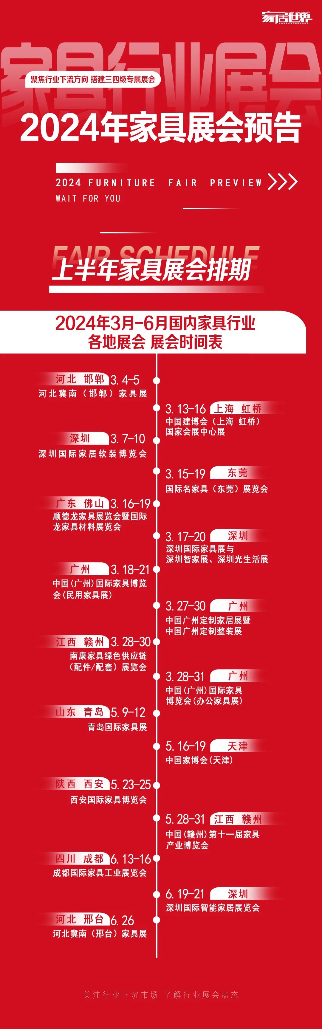 对于家具企业来说,展会是最有效的订货、招商途径,对于家具的经销商来说,展会是可以让自己高效选货、了解行业趋势、消费动向的重要机会,家居世界为家具厂商精确汇总了2024年上半年家具行业展会的举办信息,希望家具厂商根据自身情况选择参展或是观展寻找到商机、好货!