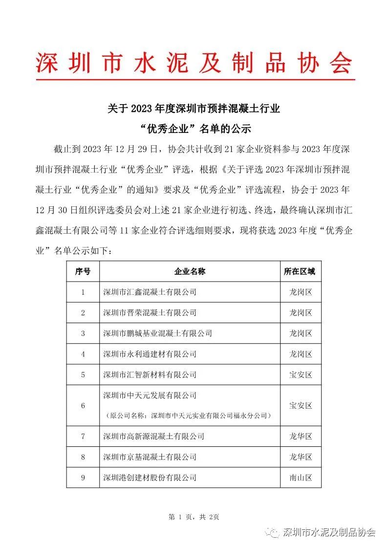 2023年度深圳市预拌混凝土行业“优秀企业”名单发布