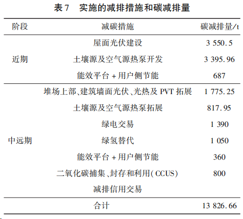 中远期 进一步拓展光伏、光热和光伏光热一体化(PV/T)及储能设施;进一步利用土壤源热泵进行制冷和供暖;通过“绿电”交易,引入可再生能源电力;利用绿氢,替代部分天然气;完善园区能源和碳排放计量管控平台,推动企业能效升级;对透平测试集中排放的二氧化碳采用捕集和封存技术;通过碳交易,降低工厂剩余碳排放。