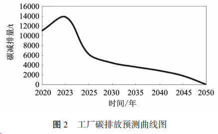 预计在2023 年项目达产碳排放达峰后,于近期(2023-2030)分期实施屋面光伏、热泵采暖及能效平台建设,快速减排至4000t/年;在远期(2030-2050年),根据可实施项目的技术和经济情况,继续实施太阳能利用、热泵替代、绿氢应用、绿电替代以及CCUS等措施,可缓速减排直至2050年左右实现碳中和,完成零碳工厂目标。