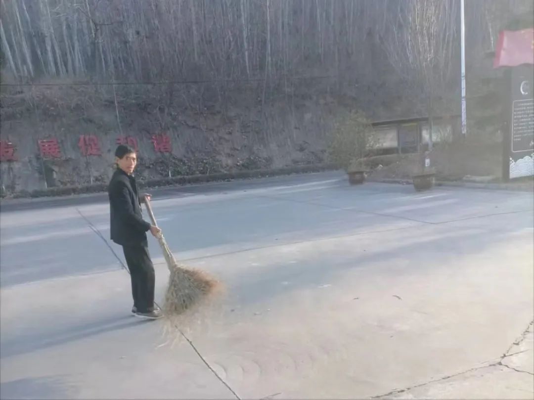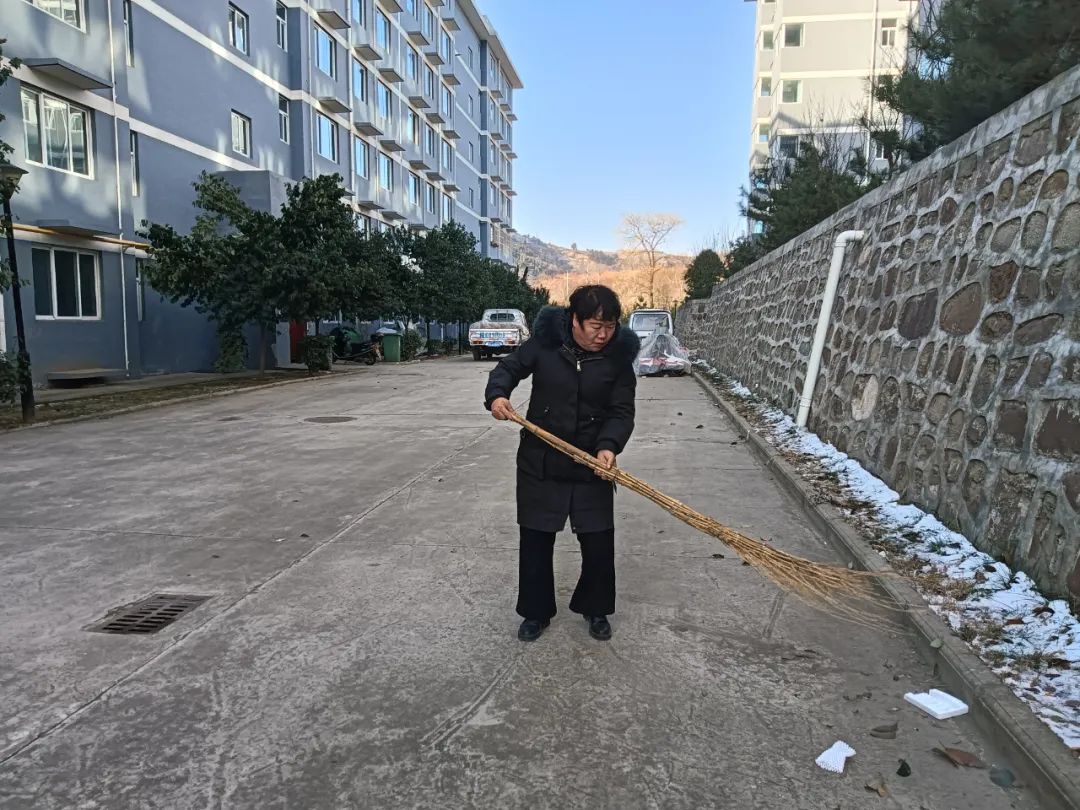 西川社区物业工作人员打扫社区公共区域的卫生,营造良好的社区环境。