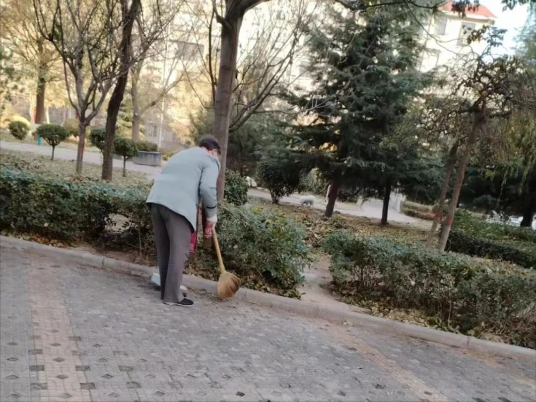 城市嘉园小区物业工作人员打扫小区公共区域的卫生,营造良好的小区环境。