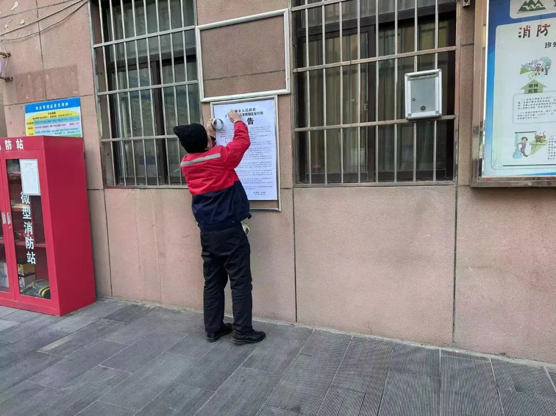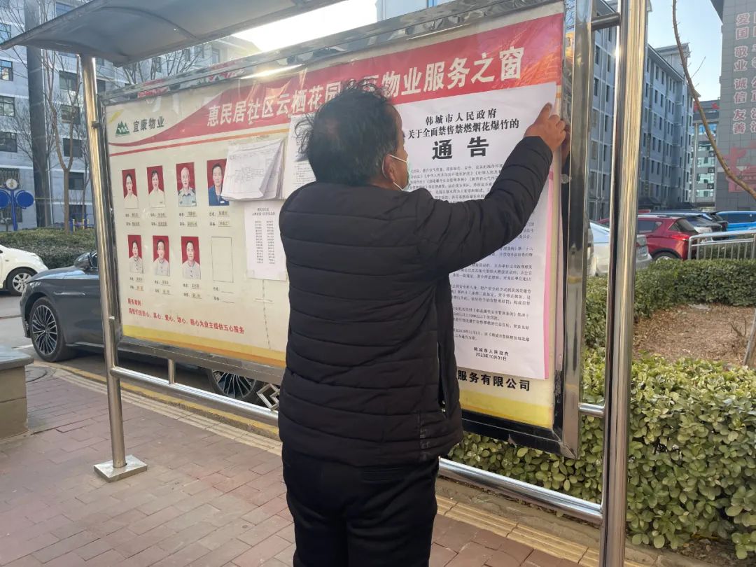 云栖花园社区物业工作人员在社区宣传栏粘贴禁止燃放烟花爆竹通告。