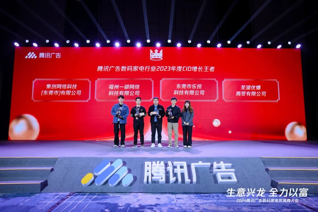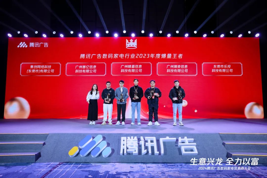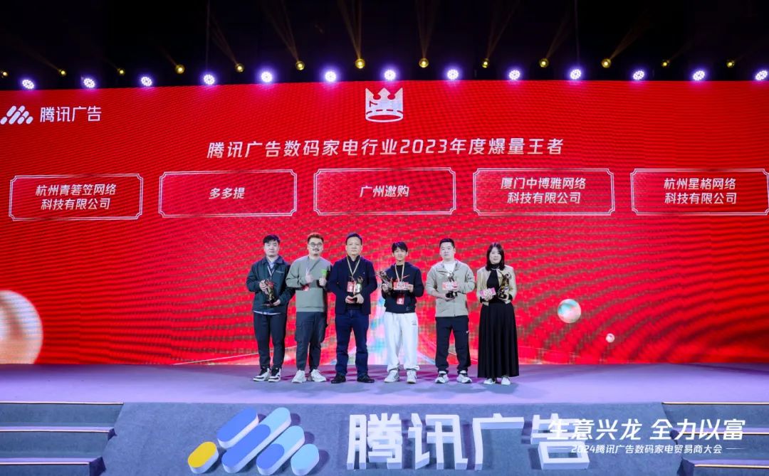 会上,腾讯广告团队为2023年度的优秀数码家电贸易商颁发了奖项,包括2023年度在腾讯生态广告运营及消耗上取得最优效果的【年度爆量王者】奖,以及在腾讯生态新交易链路上实现重大突破的【年度增长王者】奖,和在直播链路上为行业立出标杆的【年度直播爆量王者】奖。